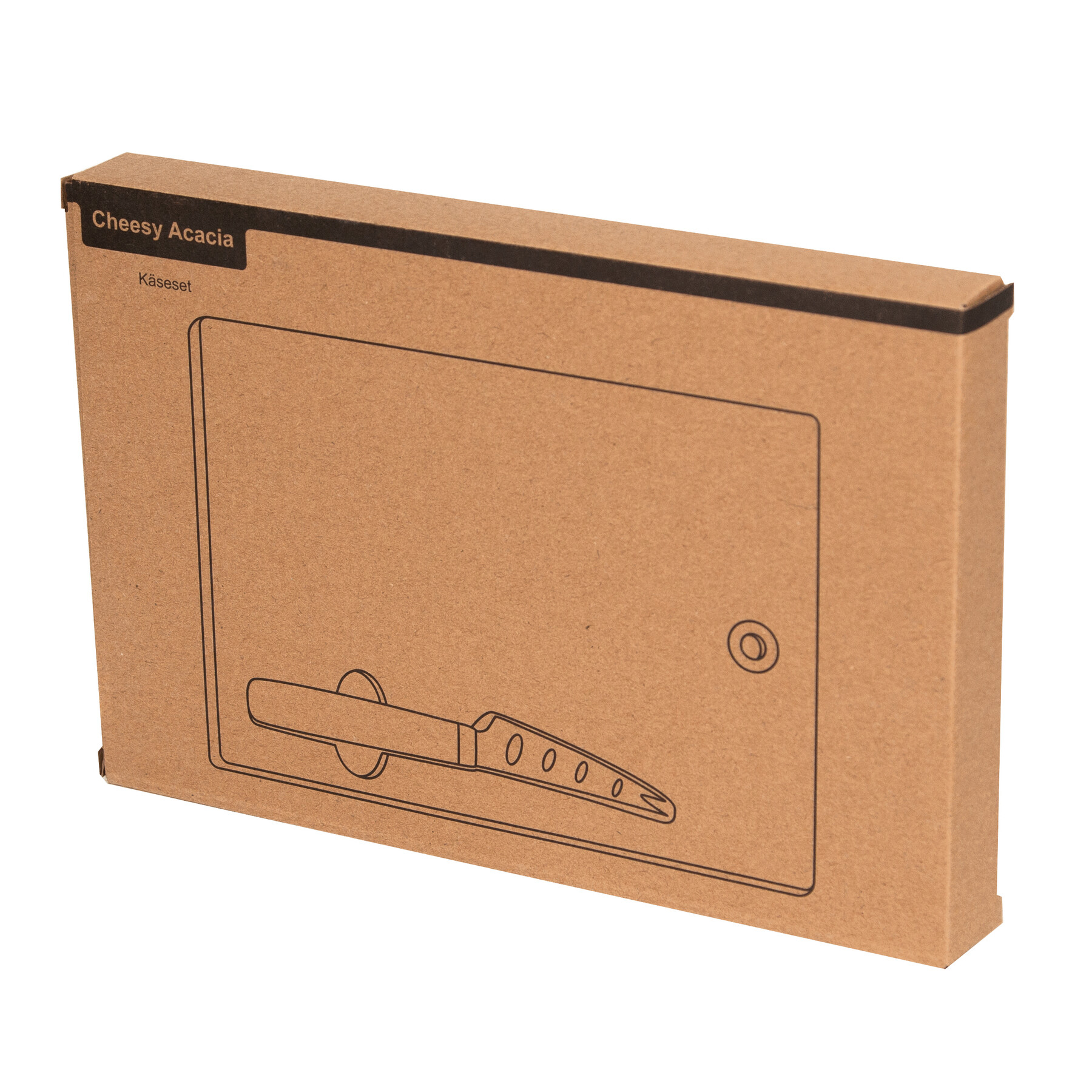 Set de quesos CHEESY ACACIA : tabla de cortar de madera de acacia, cuchillo para queso con mango de madera de acacia y hoja de acero inoxidable, el cuchillo se guarda perfectamente en el hueco con imán, orificio reforzado con acero inoxidable para colgar