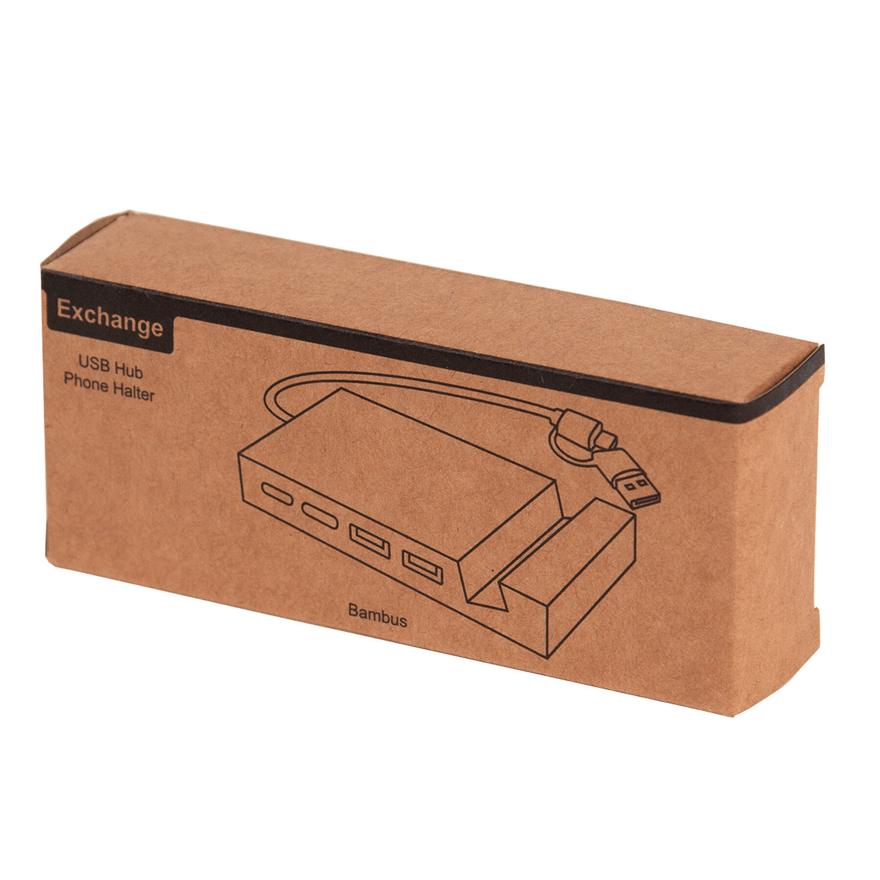 Soporte para teléfono EXCHANGE: con concentrador USB, 2 puertos USB A y 2 puertos USB tipo C, en carcasa de bambú, longitud del cable aprox. 18,5 cm, conector de entrada combinado USB A/Tipo-C